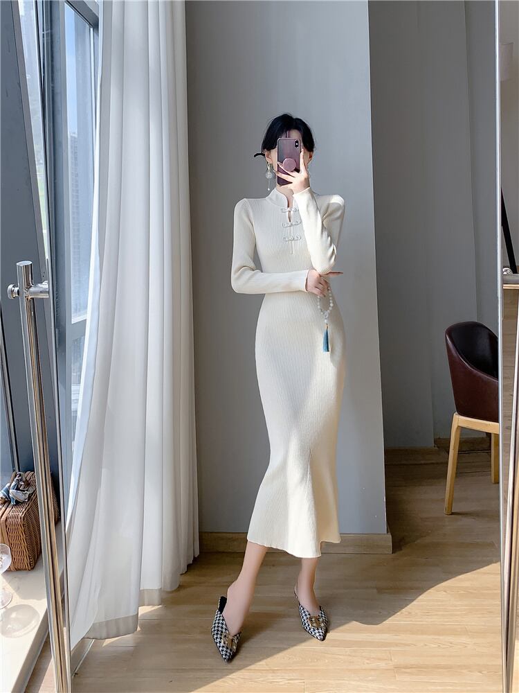 中国風レトロスリムフィットニットドレス秋ソリッドカラーボディコンニットセーターヒップフィッシュテールドレス オータム 秋物