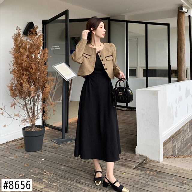 スリムカジュアルツーピースセット衣装:シック長袖チェック柄ショートジャケット + ウエストミッドレングスプリーツスカートセット ロング