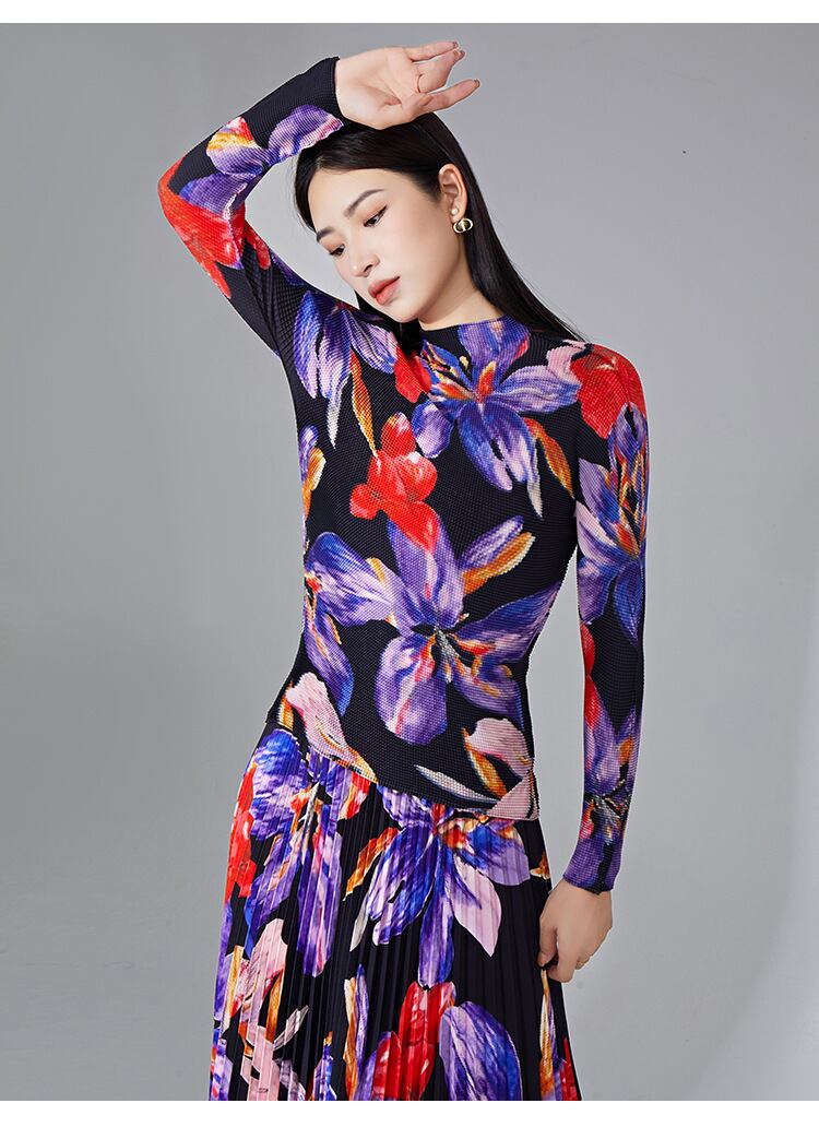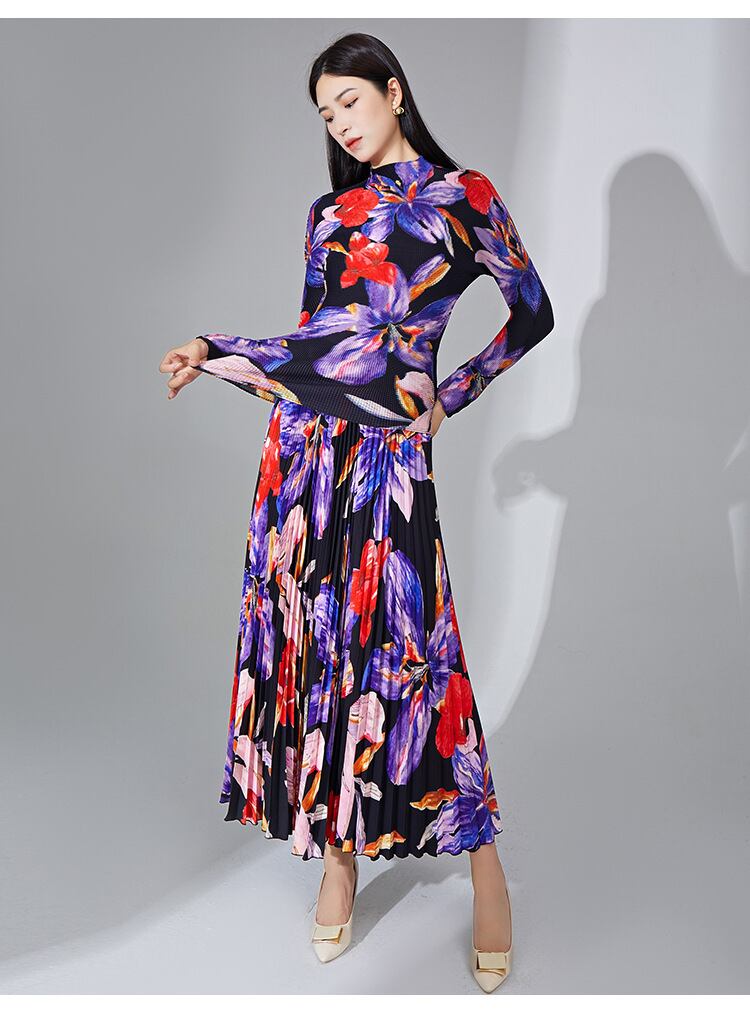 三宅プリーツ花柄プリントツーピースセットレディース衣装:タートルネック長袖スリムシャツ+プリーツスカート2点セット ロング