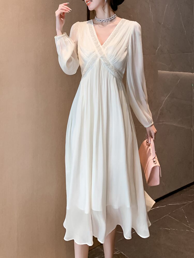 -エンドとシックビーズ糸パーティードレス春秋長袖 V ネックスリムイブニングドレス ロング スプリング 春物 オータム 秋物 Vネック