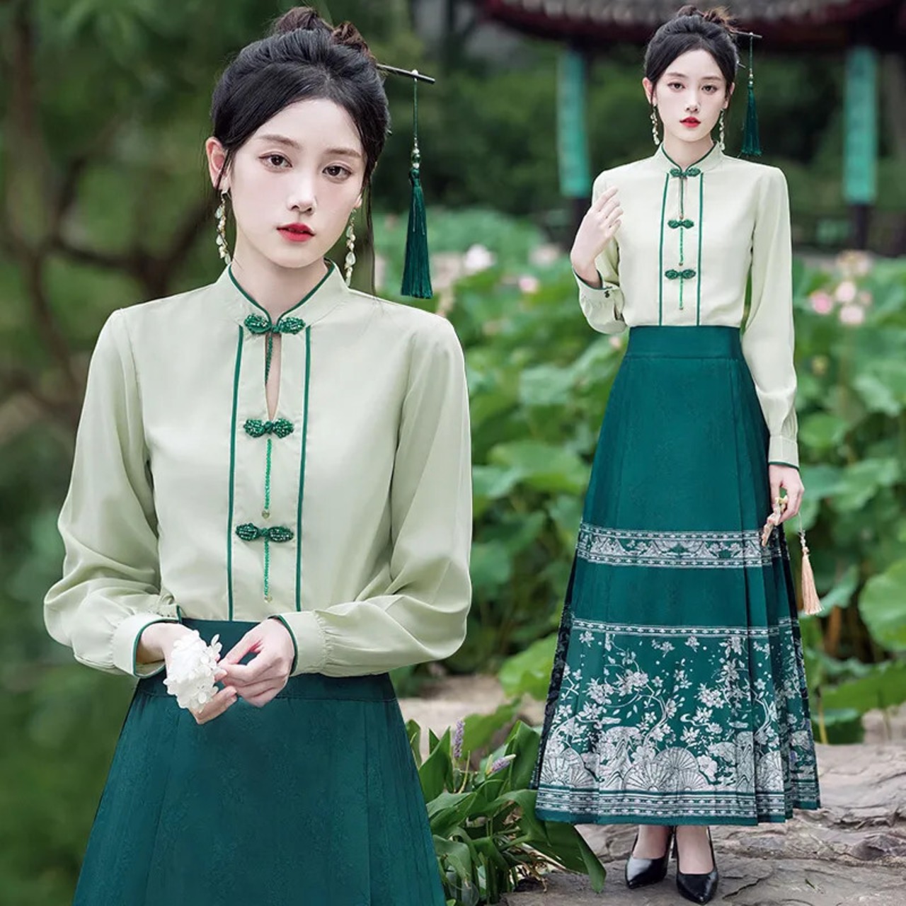 緑明朝絶妙ゴールド織り刺繍馬スカートウエスト中国改良漢ロングスカート グリーン
