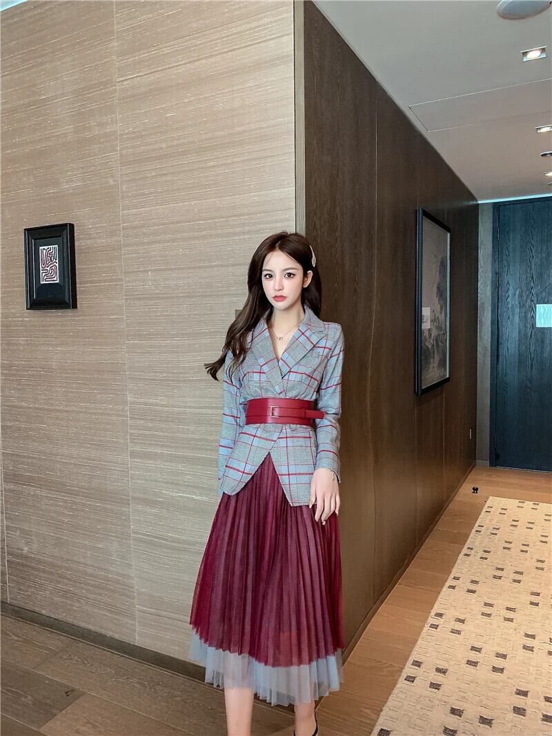 2 個セット秋チェック柄ブレザーとジャケット仕事オフィスレディスーツ + ベルト付きワインレッドプリーツメッシュスカート オータム 秋物 ハーネス 会社 学校 通勤や通学にも