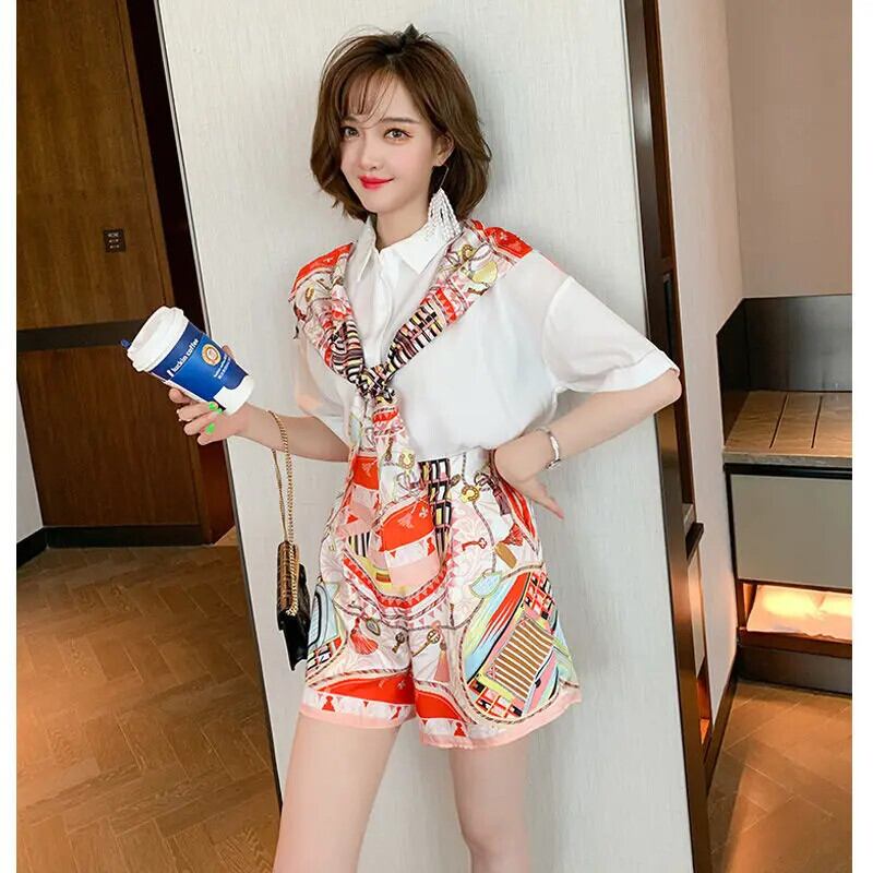 夏プリントスカーフボウシャツトップ + ワイドレッグショートセット 2 ピース衣装ルーズブラウスショートパンツセット リボン サマー 夏物 ワイドパンツ