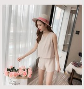ちょう結びベスト無地ツーピースセット衣装: ノースリーブラウンドネックパールトップとジッパーショートパンツ リボン ショーツ ブルマー Oネック 真珠 ソリッドカラー