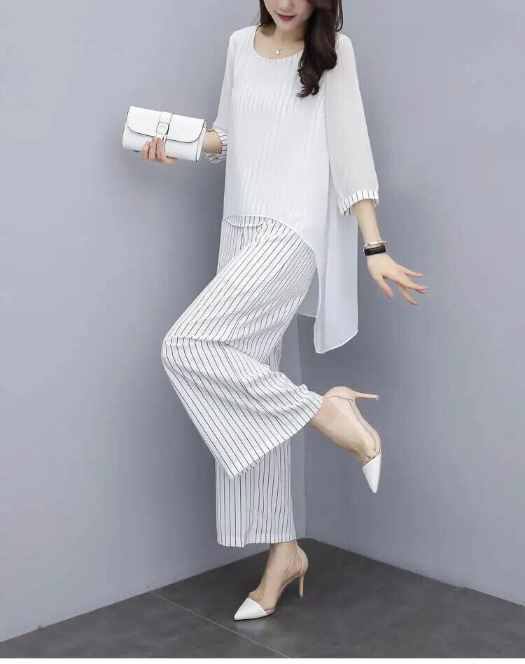 ツーピースブラウスとパンツセット夏弾性ウエストストライプシフォンワイドレッグパンツ 2 点セット衣装 エラスティック 伸縮 サマー 夏物 ワイドパンツ