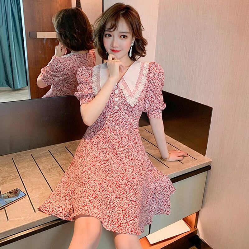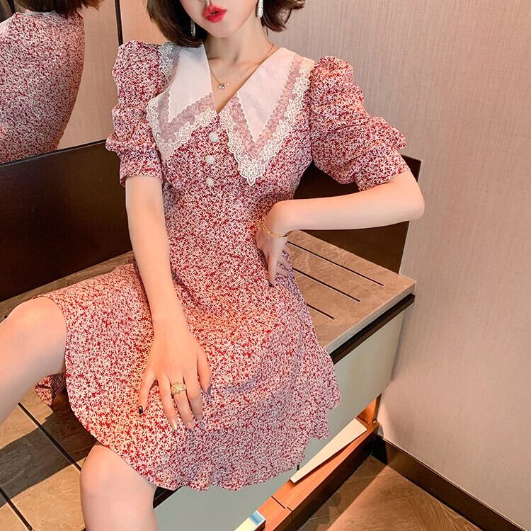花柄プリントレースラペルパフスリーブミニドレス夏かわいい人形襟半袖スリムドレス ショート ハーフスリーブ 大人ガーリー スウィート キュート カジュアル サマー 夏物