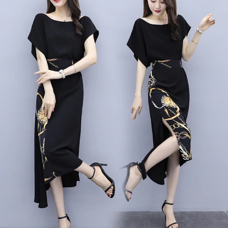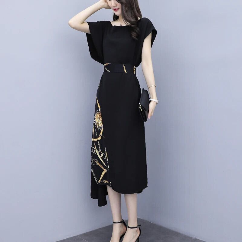 プリントブラックドレス O ネック半袖ウエストドレススプリットビジネスオフィスサマードレスプラスサイズ ショート ハーフスリーブ 大きめサイズ 夏物 Oネック 会社 学校 通勤や通学にも