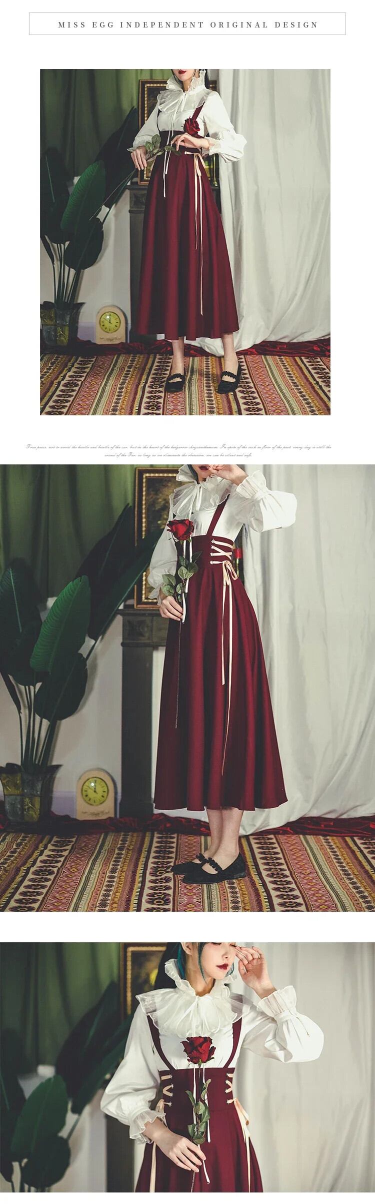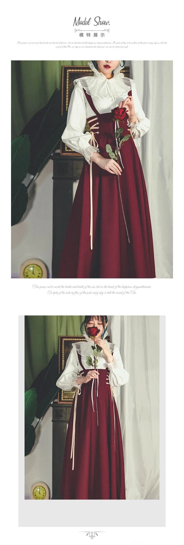 2点セット衣装:長袖レース襟白シャツ+バーガンディチュニック包帯ロングスカートセット2点セット ホワイト