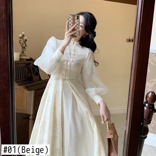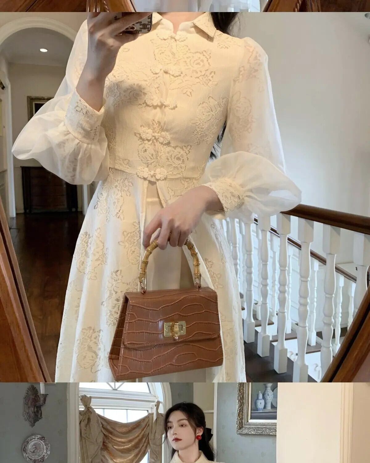 レースレトロバックル長袖パッチワークメッシュ改良されたチャイナドレス中国風 2 ピースドレス ロング