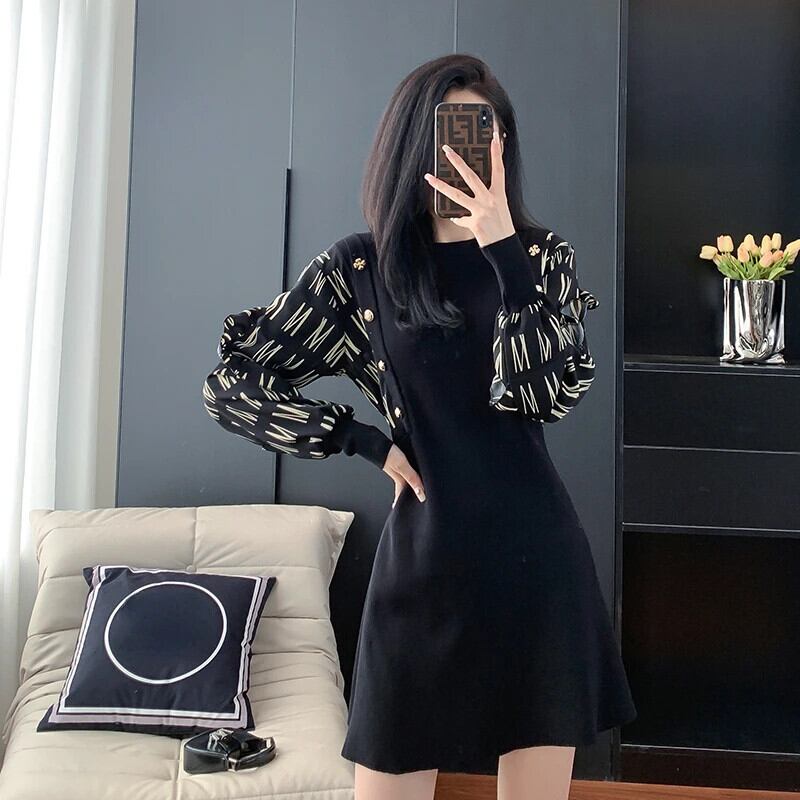 黒パッチワークニットミニドレス秋と冬ラウンドネック長袖スリムストリートドレス ロング ブラック オータム 秋物 ウィンター 冬物 Oネック