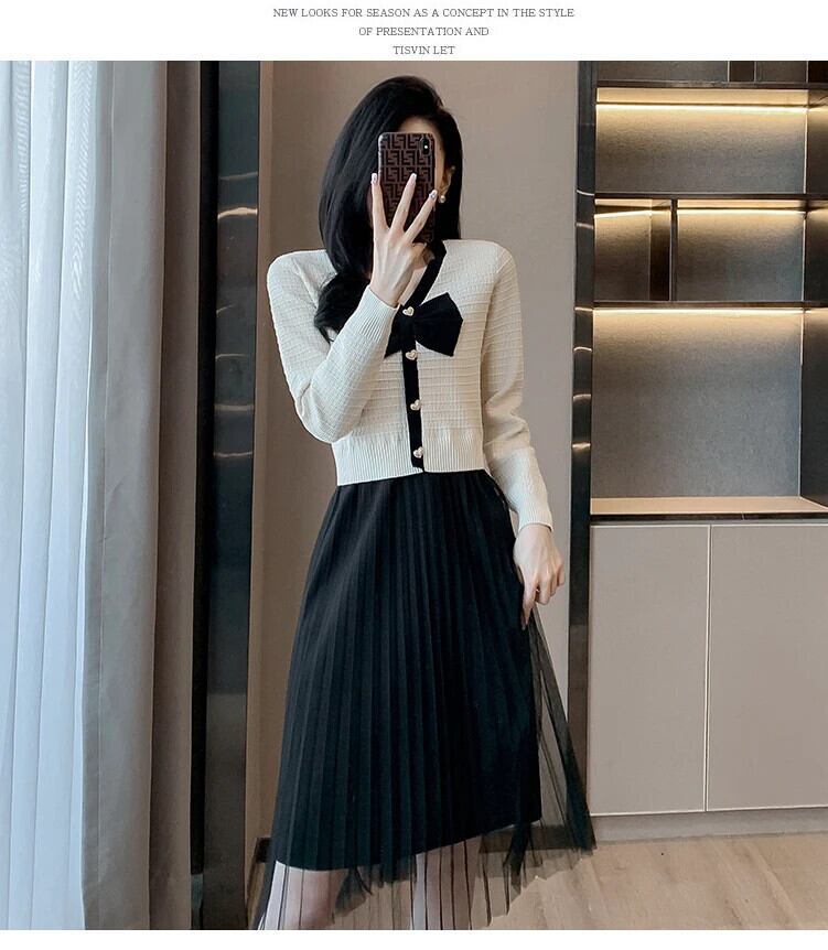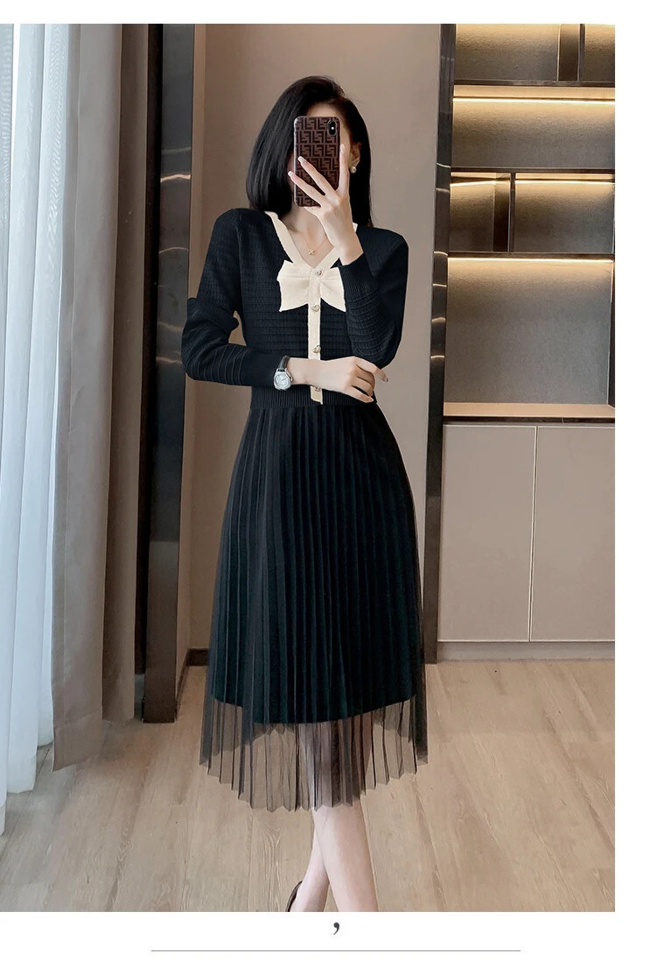 ベージュメッシュスプライスニットミディドレス秋オフィス V ネック弓長袖スリムドレス ロング リボン オータム 秋物 Vネック 会社 学校 通勤や通学にも