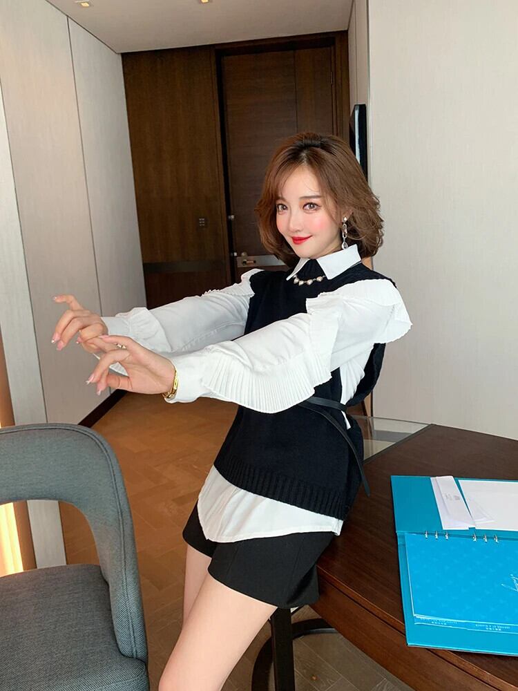 秋冬プリーツフリルラペルブラウスツーピースセットニットウエスト長袖ベルトピュアカラープリーツスーツ ロング オータム 秋物 ウィンター 冬物 ハーネス