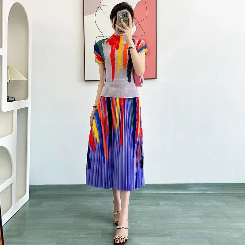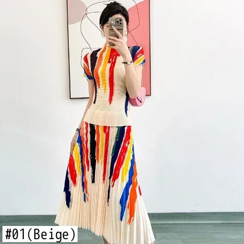 Miyak プリーツ抽象プリント 2 点セット衣装: 弾性タートルネックスリムトップ + ウエストスカートレディース 2 ピースセット エラスティック 伸縮