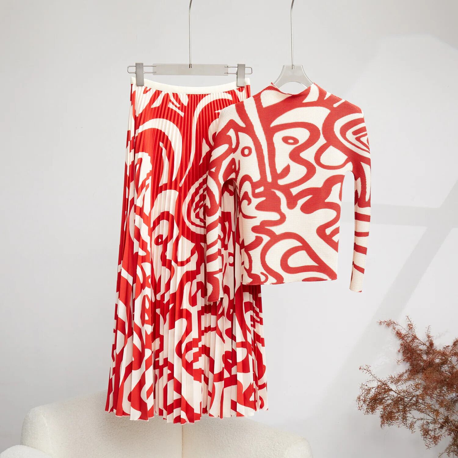 三宅プリーツ抽象ストライプ 2 点セット衣装春と秋スリムボトム Tシャツ + プリーツスカートセット スプリング 春物 オータム 秋物