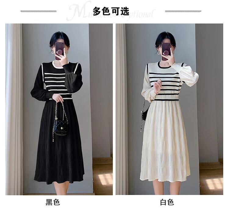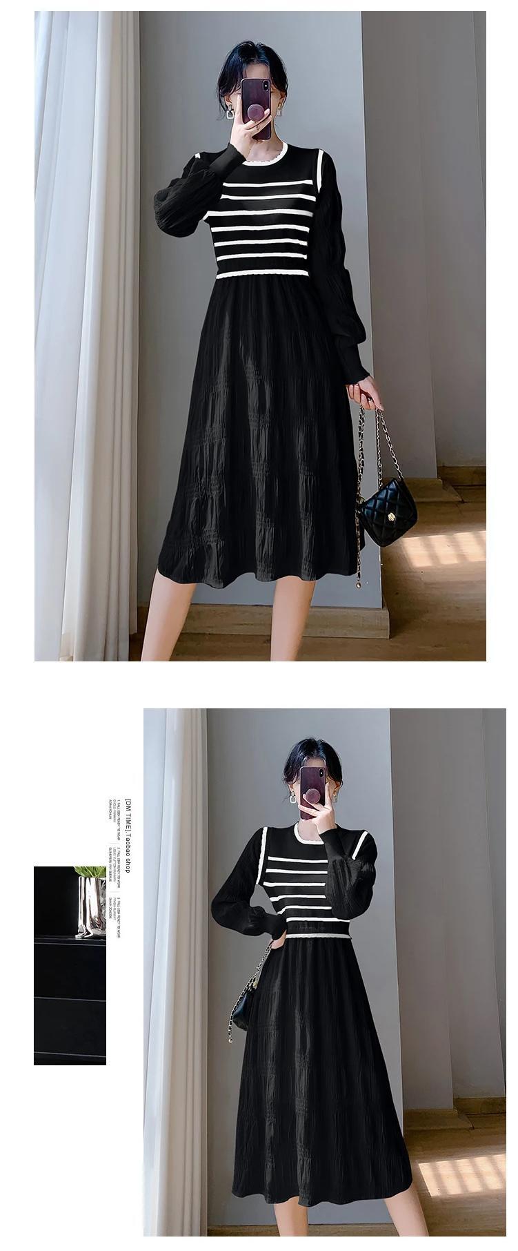 スタイル Clic ストライプニットスプライシングミディドレス秋 O ネック長袖スリムドレス ロング オータム 秋物 Oネック