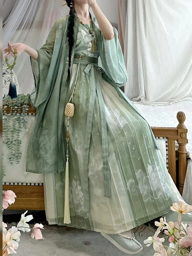 中国風宋代漢妖精セット: トップ + ロングプリーツスカート + ロングカーディガングリーン 3 点セット衣装