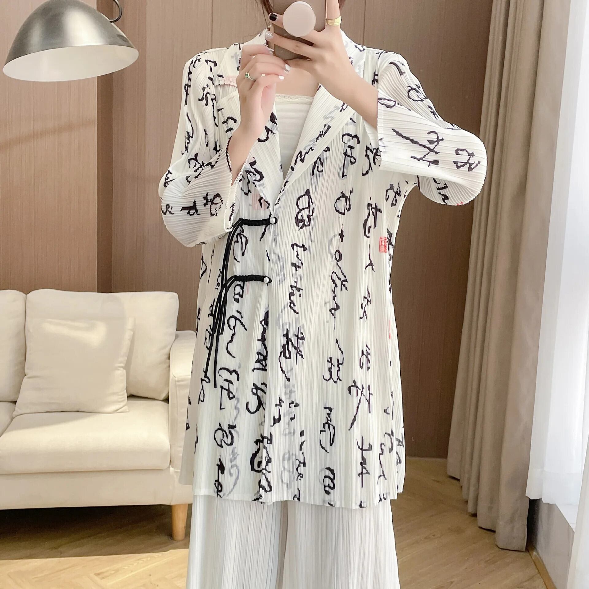三宅プリーツ 2 点セット衣装: 中国風レトロボタン付きブラシレタリングプリントブレザー + ワイドレッグパンツ 2 本セット