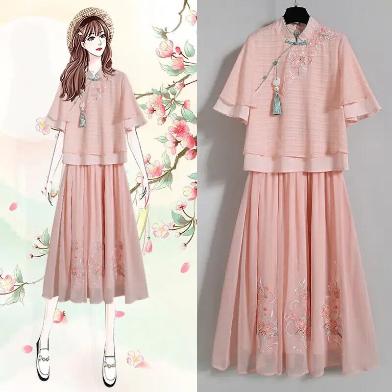 中国改良された絶妙刺繍韓ツーピースセット衣装:レトロスタンドカラーストライプトップ+ハイウエストミディスキットセット ハイウェスト