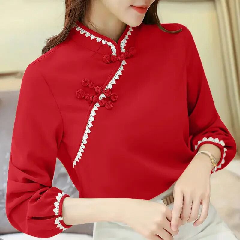 長袖ステッチレースレディースコートレトロスタンドカラー長袖ボトリングシャツシンプル通勤中国シフォンブラウス ロング