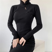 中国風修正されたチャイナドレスニットセータードレスレトロスタンドカラー長袖スリムボディコンセクシースリットドレス ロング