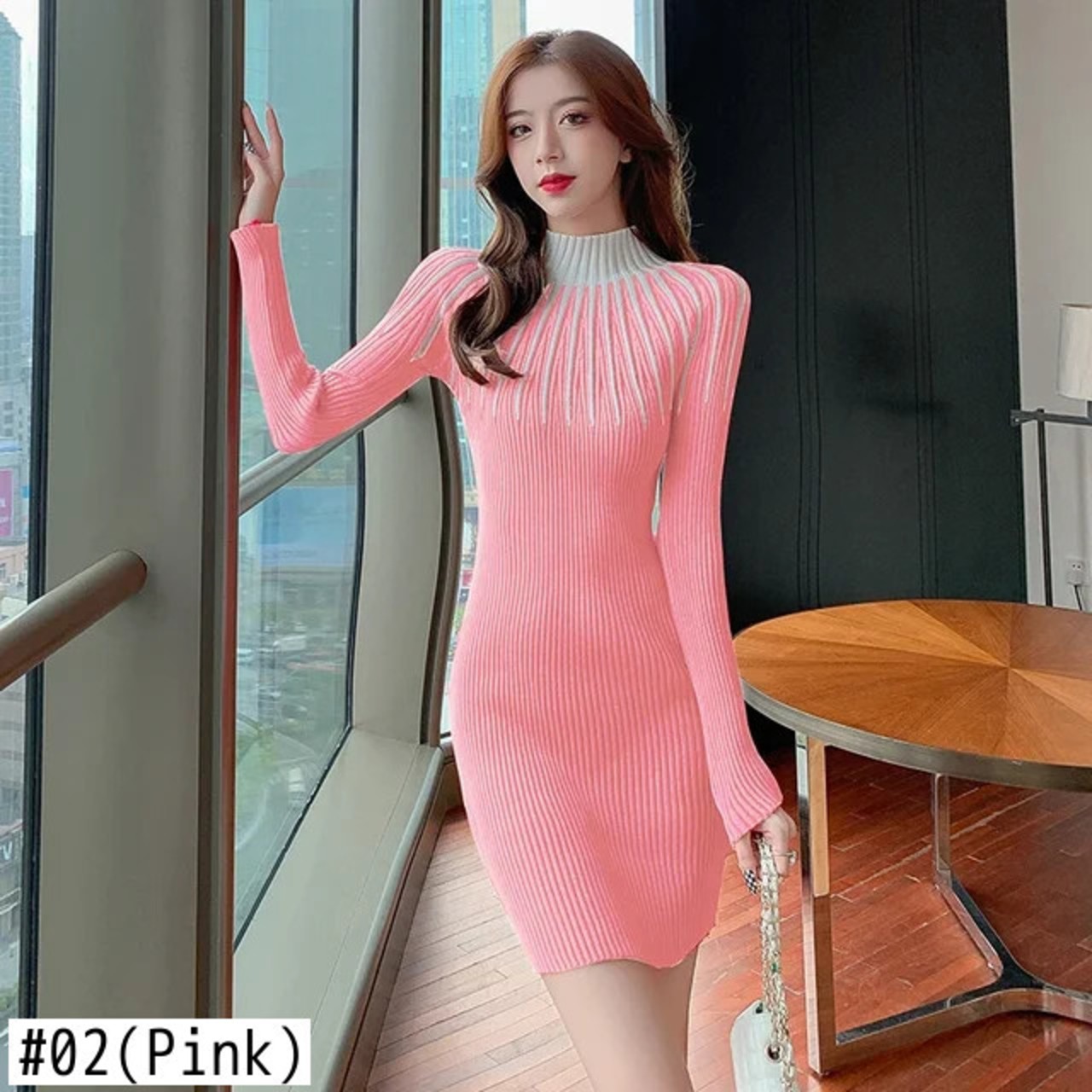 赤と白パッチワークベーシックニットドレス秋タートルネック長袖スリムボディコンミニドレス ロング ホワイト レッド オータム 秋物