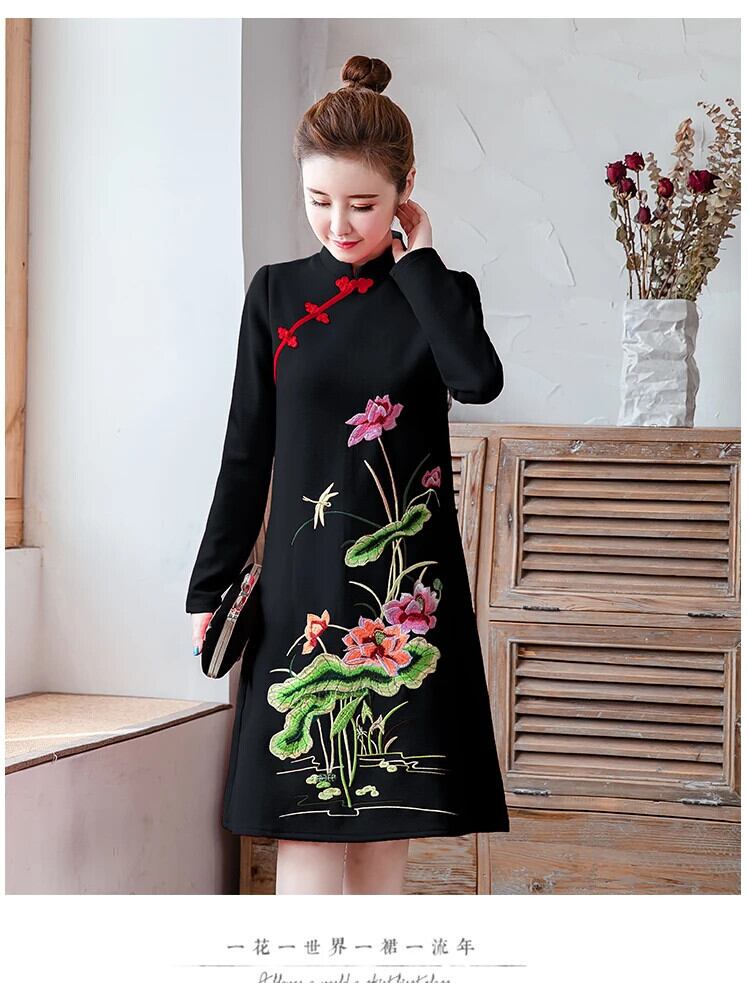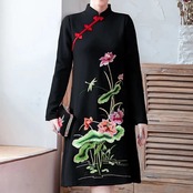 中国風改良されたチャイナドレス絶妙蓮刺繍ドレス秋と冬黒スリムイヤードレス ブラック オータム 秋物 ウィンター 冬物