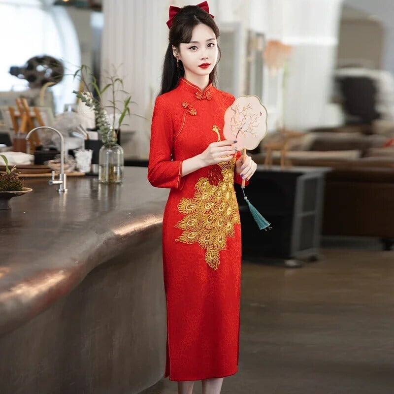 中国風絶妙フェニックス刺繍改良されたチャイナドレス赤スタンドカラースリムスリット結婚式宴会ドレス レッド