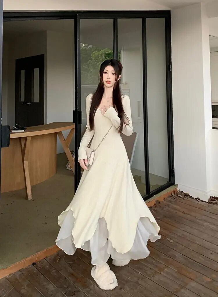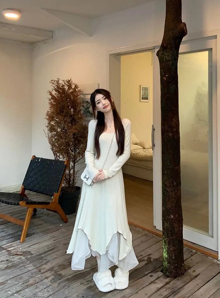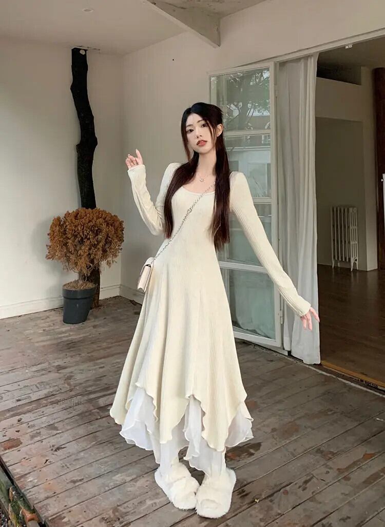 ソリッドカラーニット不規則ドレス秋と冬スクエアネック長袖スリム甘いドレス ロング 大人ガーリー スウィート キュート カジュアル オータム 秋物 ウィンター 冬物 スクウェア