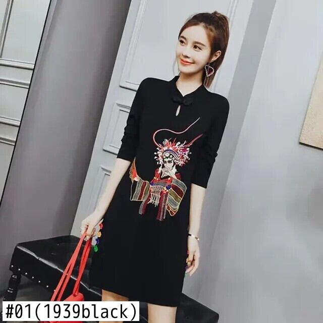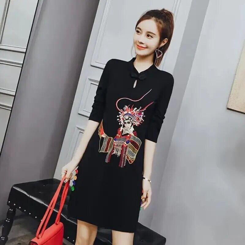 現代改良されたチャイナドレス絶妙京劇キャラクター刺繍ドレスレトロスタンドカラースリムパーティードレス