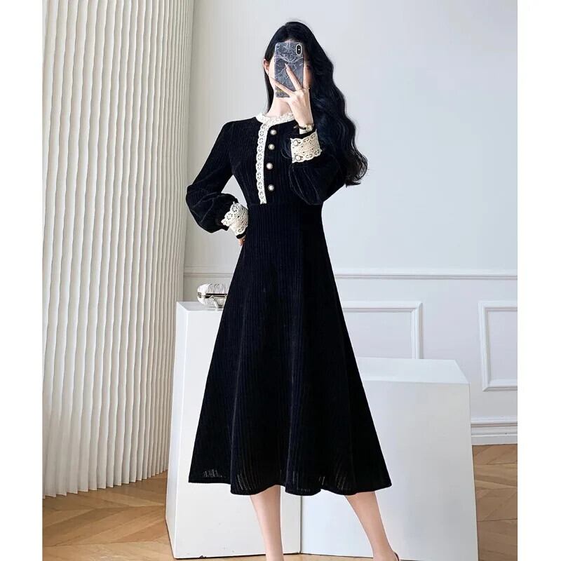 フレンチコーデュロイレースパッチワークミッドレングスドレス秋と冬ラウンドネック長袖黒スリムAラインドレス ロング ブラック オータム 秋物 ウィンター 冬物 Oネック