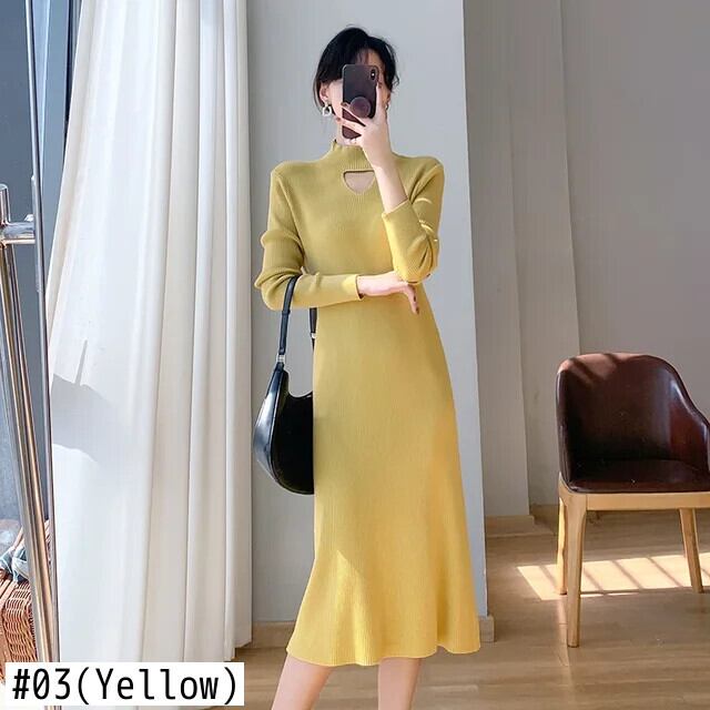 スタイルイエロースリムニットセータードレス冬タートルネック長袖ボトミングミディドレス ロング ウィンター 冬物