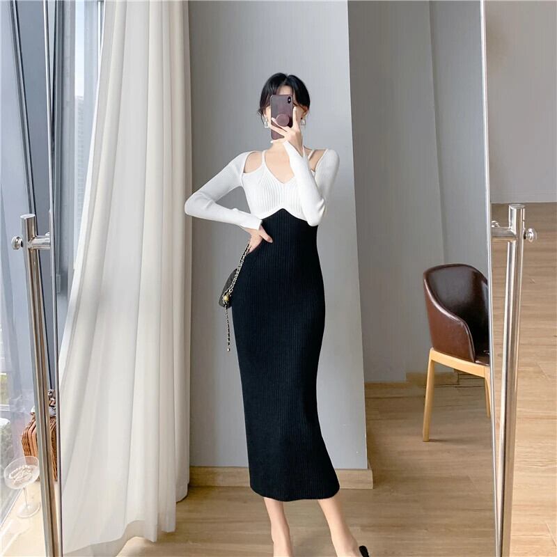 2024 シック V ネックホルターネックニットドレススリムフィット黒と白スプライシングタイト底ヒップドレス ホワイト ブラック Vネック