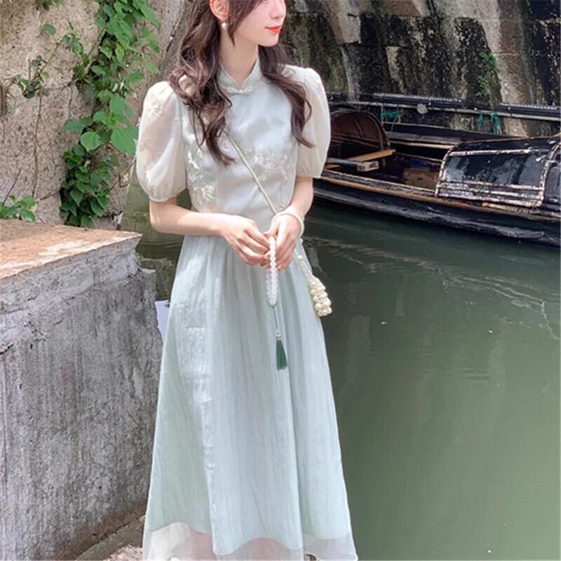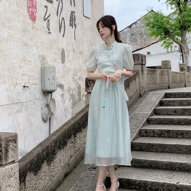 中国風改良チャイナドレス刺繍ドレス夏レトロスタンドカラーバックルチュニックパーティードレス サマー 夏物