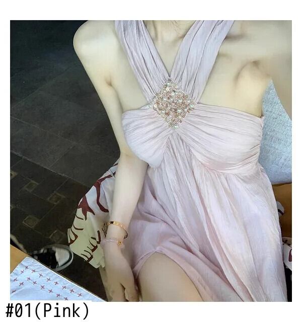 ピンクビーズホルターネックロングドレス 2024 春と夏セクシーオフショルダーノースリーブロングホリデーパーティードレス スプリング 春物 サマー 夏物