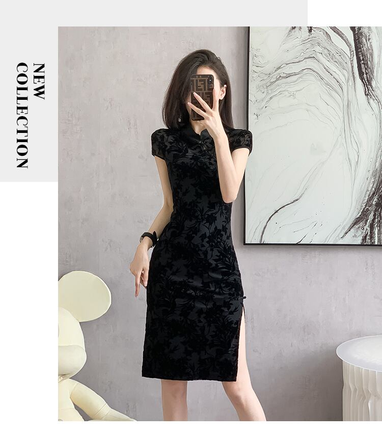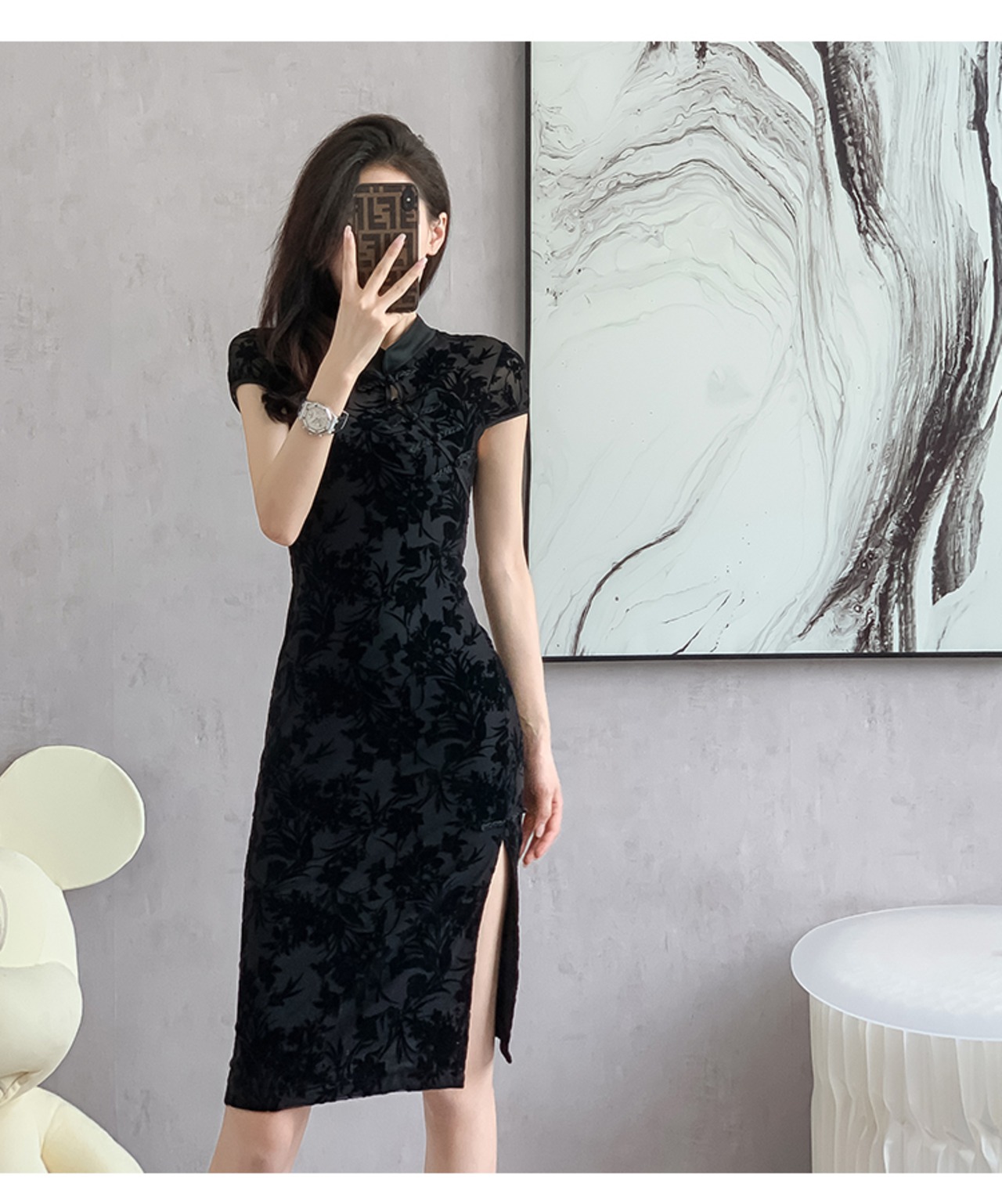 黒修正植毛プリントストレッチチャイナドレス中国レトロスタンドカラーカエルスリムセクシーパーティードレス ブラック