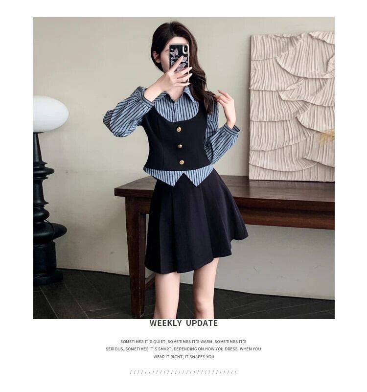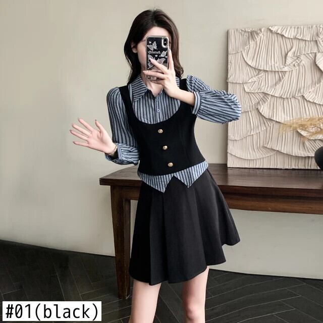 2 ピーススカートセット:Clic ラペルストライプブラウストップス + 黒プリーツミニスカート Y2K 2 ピース衣装 ブラック