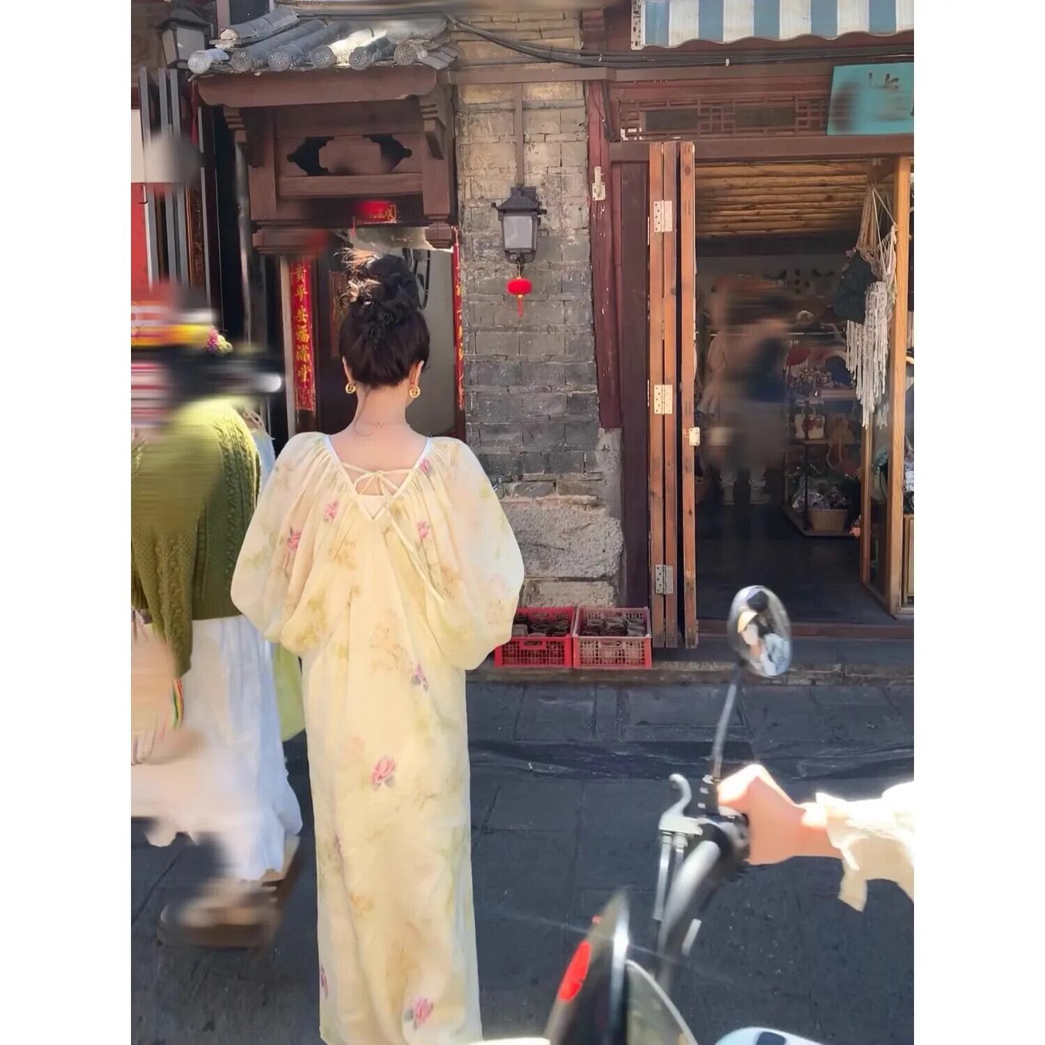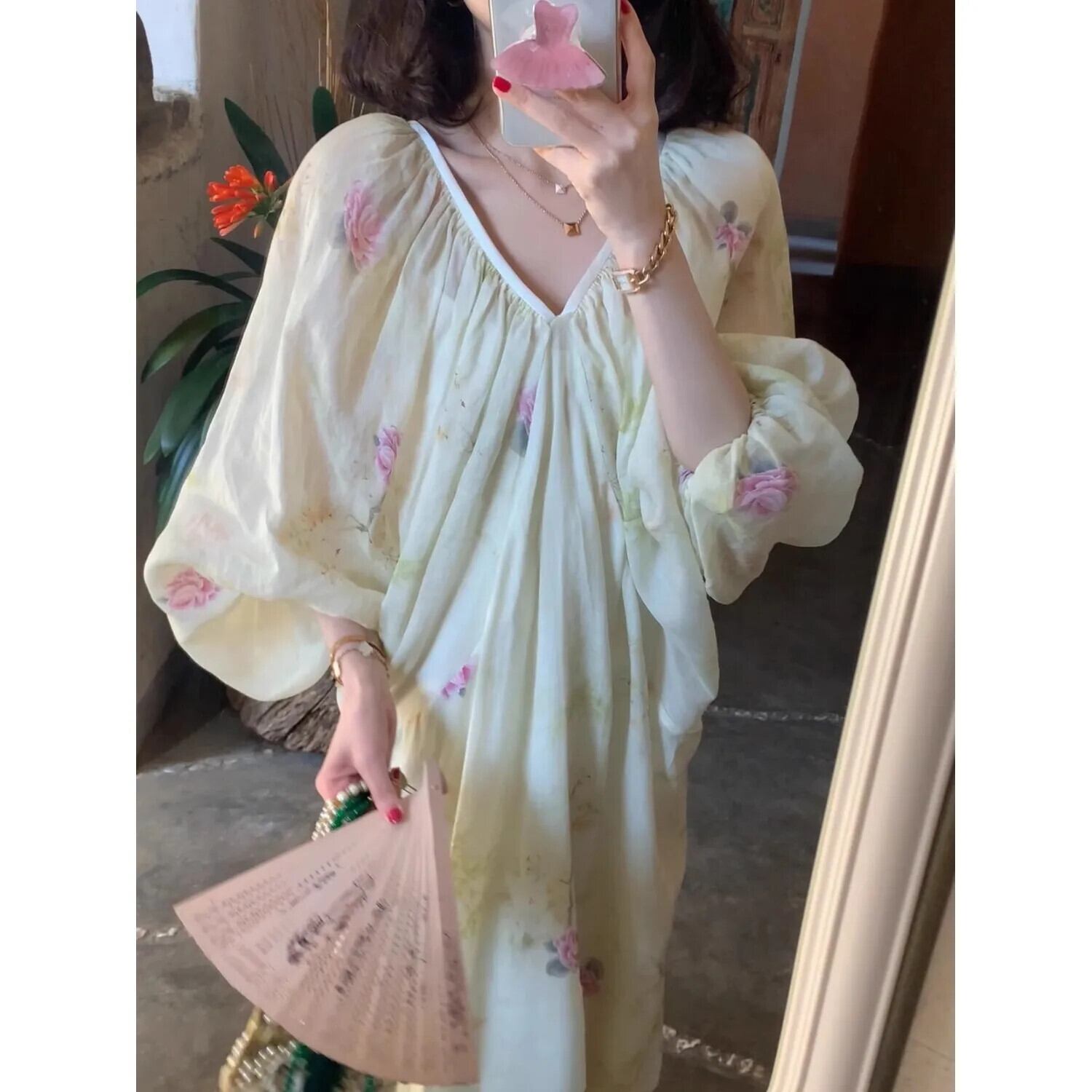 2024 夏ランタンスリーブ V ネックルーズロングドレスプリントホリデードレス Vestidos デ サマー 夏物 Vネック