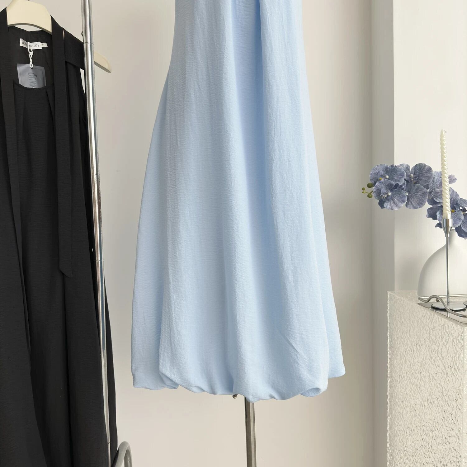 オフィスレディ可バドドレス夏ブルーブラックドールカラープリーツストラップスリムAラインノースリーブドレス サマー 夏物 ソリッドカラー 会社 学校 通勤や通学にも