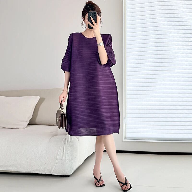 黒紫ピンクベルスリーブ三宅プリーツドレス秋 ese Clic ソリッドカラーシンプルスタイルミニシャツドレス ブラック オータム 秋物 パープル
