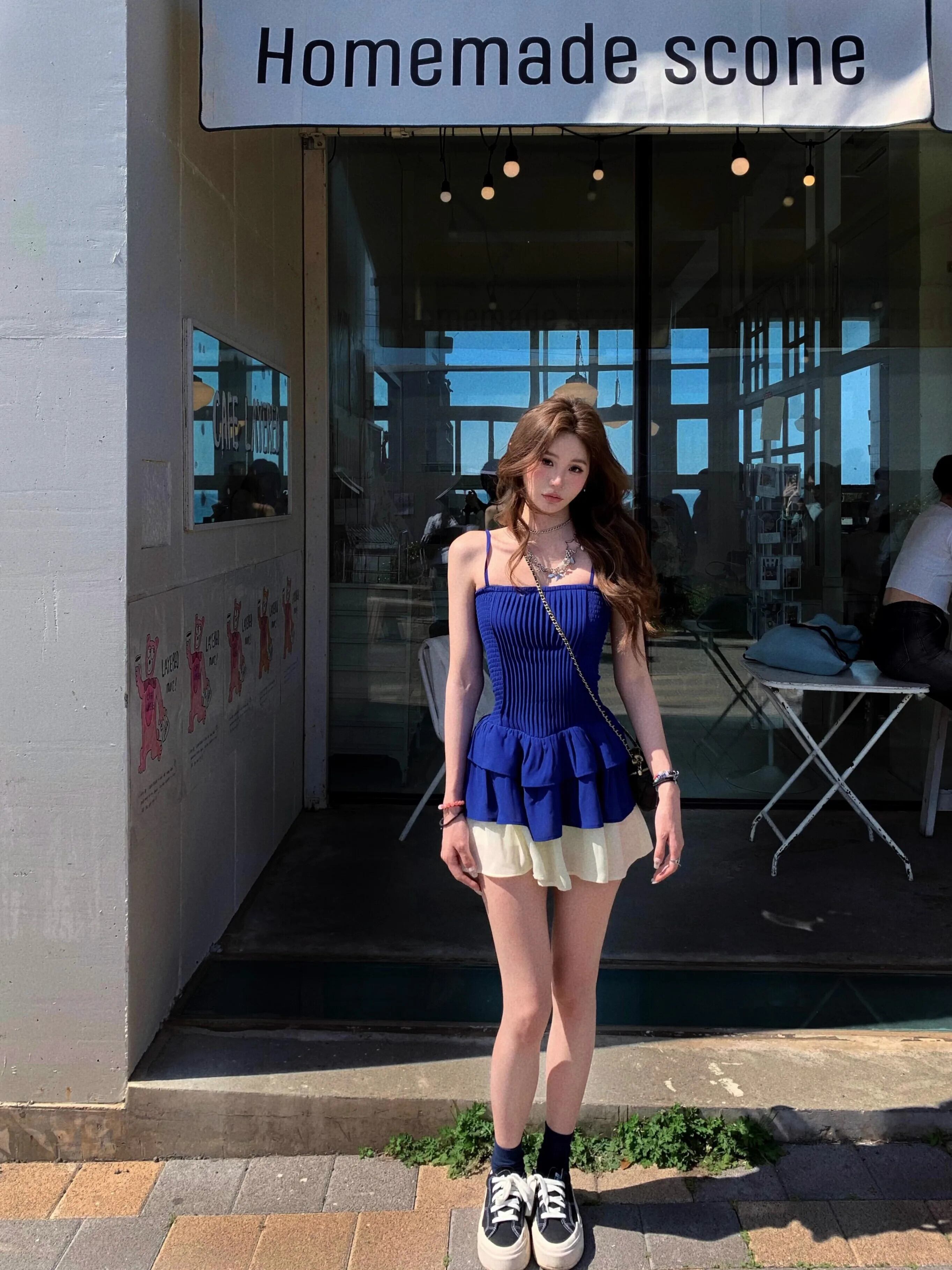 ビーチスタイルトレンド夏青と白ステッチスリムミニサスペンダードレスオフショルダー背中開いたサンドレス ホワイト ブルー サマー 夏物