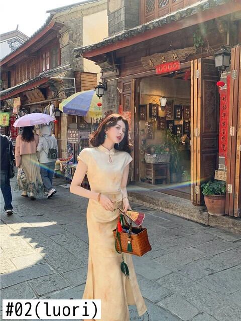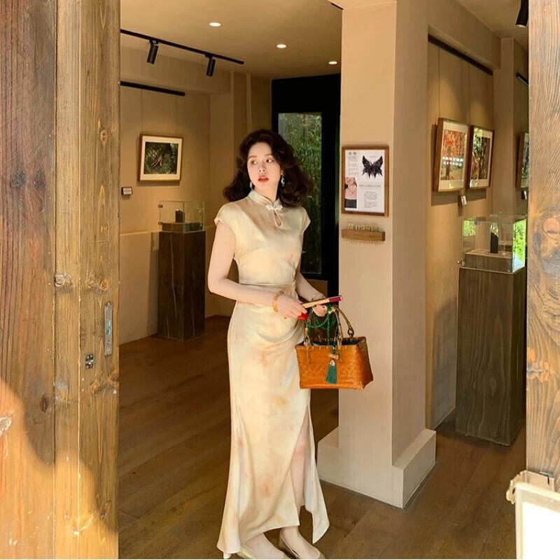 2024 中国シックスプリットチャイナロングドレス夏レトロスリムボディコン半袖ドレスパーティー ショート ハーフスリーブ サマー 夏物