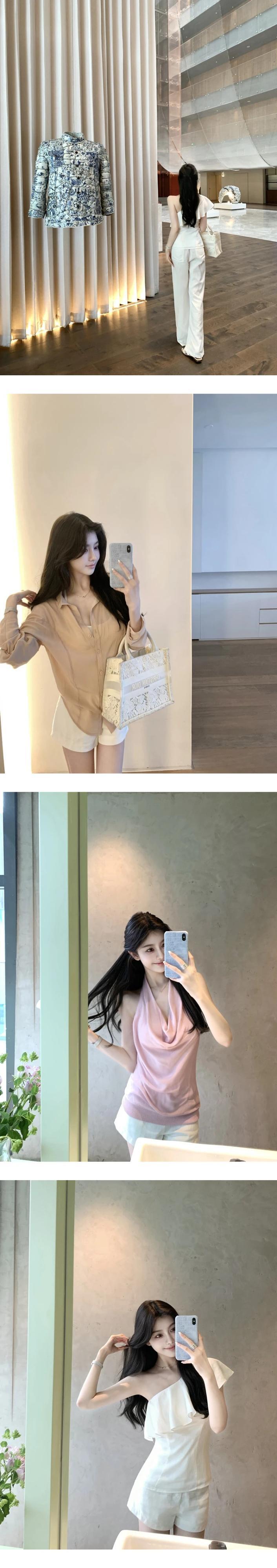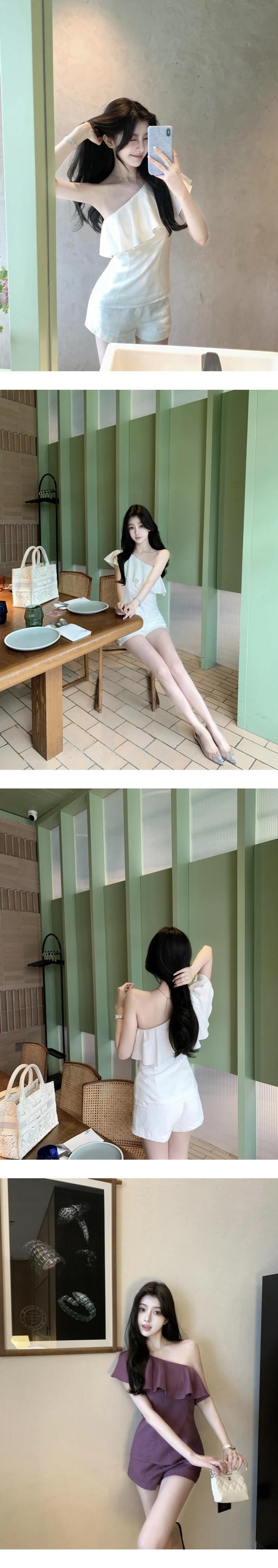 フリル傾斜ショルダートップ夏フレンチ不規則セクシーショートシャツ + ソリッドカラーショーツ 2 枚セット サマー 夏物 ブルマー