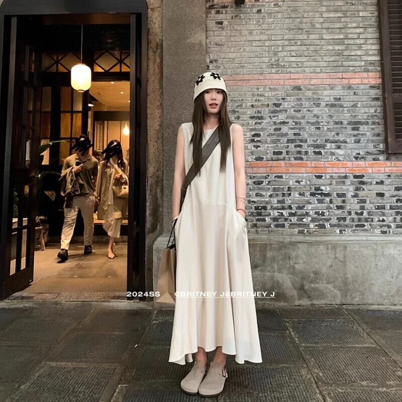 2024 秋ストリートトレンドノースリーブベストドレス黒と白大きポケットフリルルーズドレス ホワイト ブラック オータム 秋物
